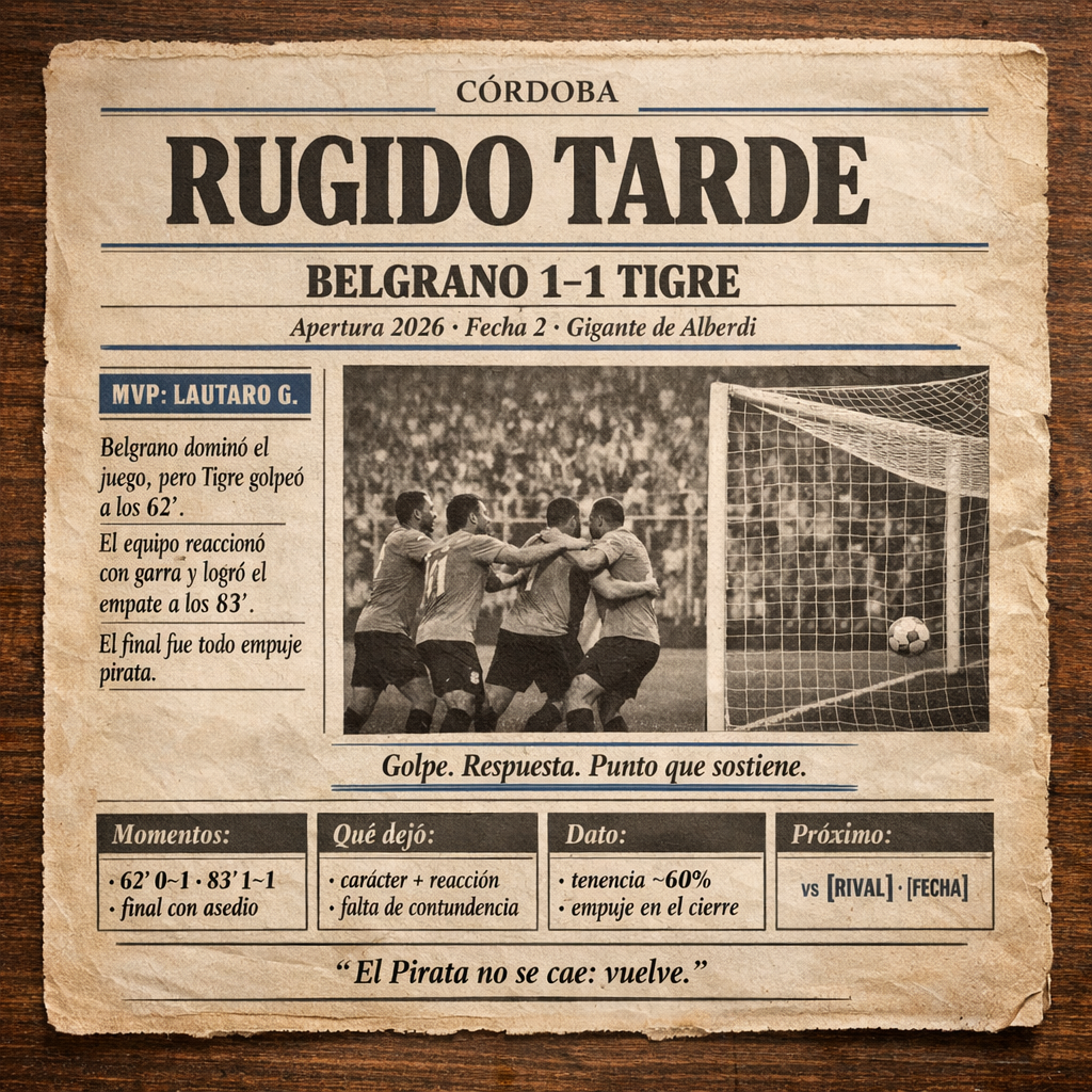 En el Gigante de Alberdi, Belgrano manejó el partido con el timón firme: más posesión (60%) y una búsqueda constante por las bandas, pero con pocas puñaladas limpias al área. Tigre, paciente, esperó su ventana… y la encontró a los 62’ con el 0–1 de David Romero, un golpe seco que no reflejaba el dominio territorial, pero sí la frialdad del rival cuando tuvo la suya.